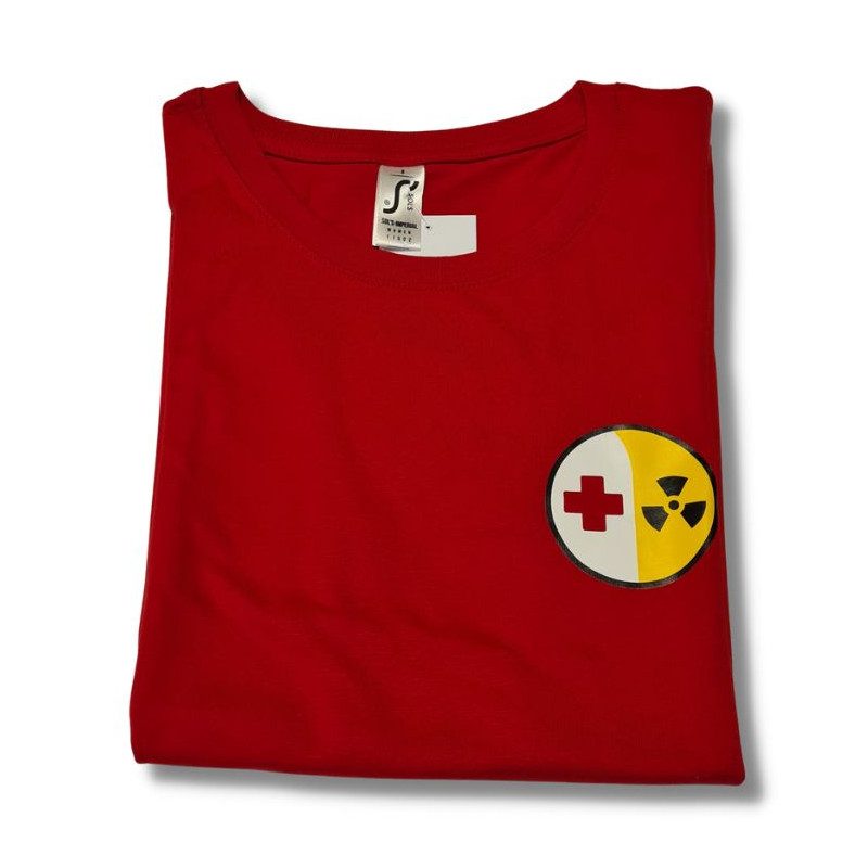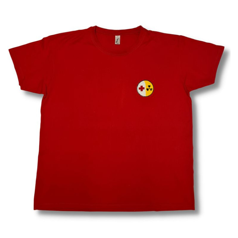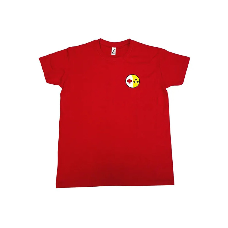 Egyedi nyomott múzeumi logóval ellátott, klasszikus, piros színű férfi póló.